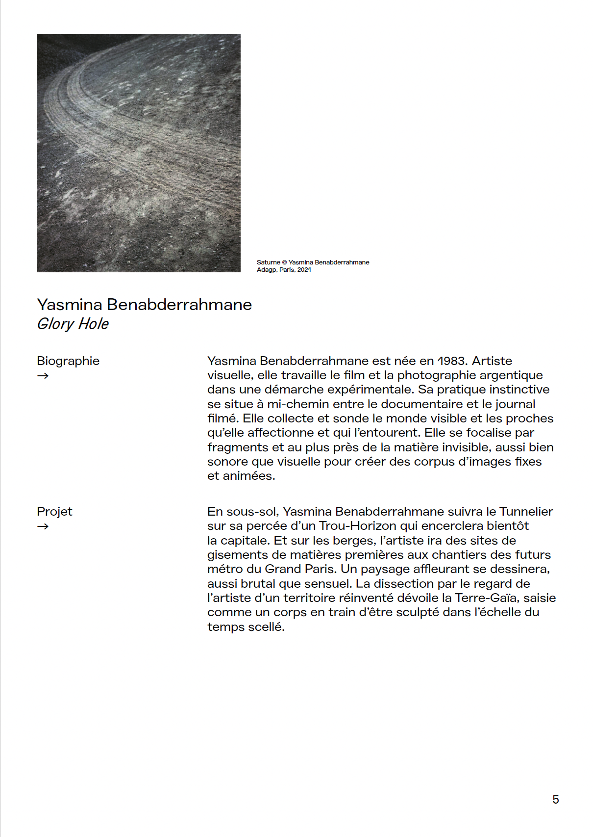 Cette perspective holistique du paysage est caractéristique du travail de Yasmina Benabderrahmane, notamment avec "Glory Hole" qui documente, par un film en super 8 / 16 mm, l’aménagement des métros en cours de la Société du Grand Paris . La cartographie urbaine des déplacements, mais aussi celle des industries et des déserts urbains que génère le projet du Grand Paris relève d’une anamnèse. Documenter ainsi l'incursion de lourdes machines de chantier dans les couches profondes, viscérales, d'un territoire anthropomorphisé évoque le phénomène de régression qui, en psychanalyse, actualise, situe et permet de se réapproprier ce dont nous sommes faits – une appartenance sédimentée à un lieu ancestral, un traumatisme collectif, une histoire obsédante. Une once d’érotisme et sensualité traverse aussi ces associations, dans lesquelles la surface de la pellicule, la sensualité charnelle de la peau de la terre et le regard lui-même fusionnent, révélant le paysage comme une forme de désir visuel.
