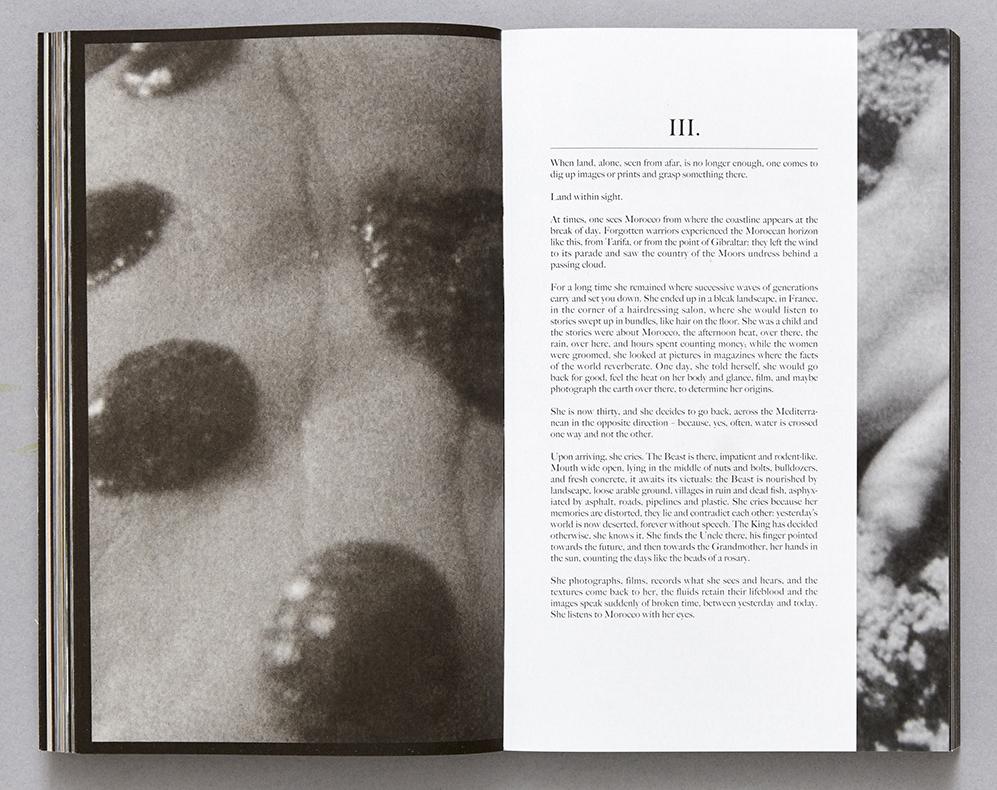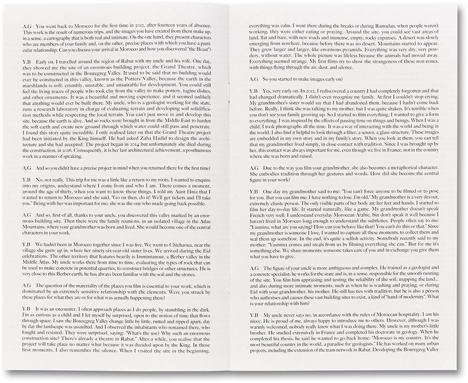 Cet ouvrage, composé uniquement de photogrammes issus de son travail filmique, en noir et blanc et en couleur, plonge le lecteur au cœur du projet réalisé par Yasmina Benabderrahmane au Maroc entre 2012 et 2019. Entre métaphore et fragments bruts, surgissent au fil des pages les différents protagonistes de ce conte visuel : l’Oncle, la Grand-Mère et la Bête. De ces espaces et de ces corps familiers, où se joue l’histoire contrariée du Maroc contemporain, Yasmina Benabderrahmane cherche à s’approcher du détail et des matières, des mains qui façonnent et reproduisent, au fil des âges, les mêmes gestes.